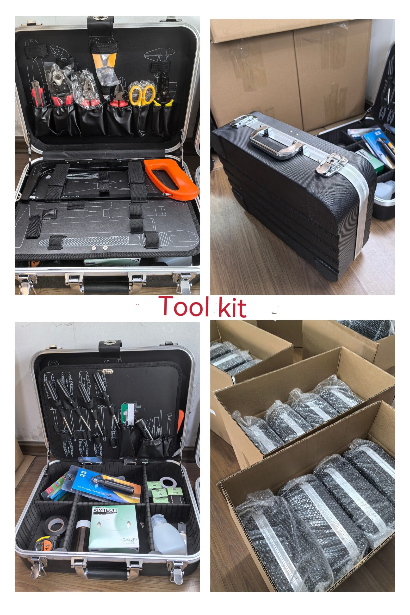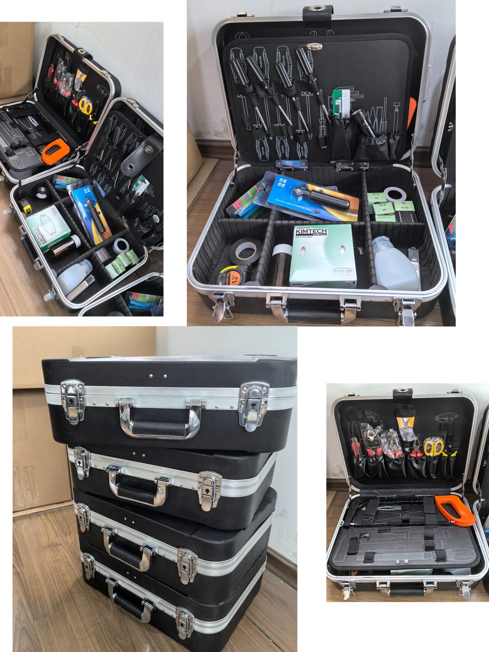 - Equipped with high-precision tools including a fiber cleaver, stripping/crimping tools, fusion splicer adapters, OTDR testers, and ESD-safe cleaning kits.